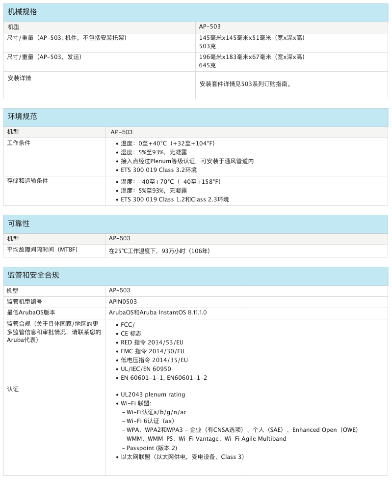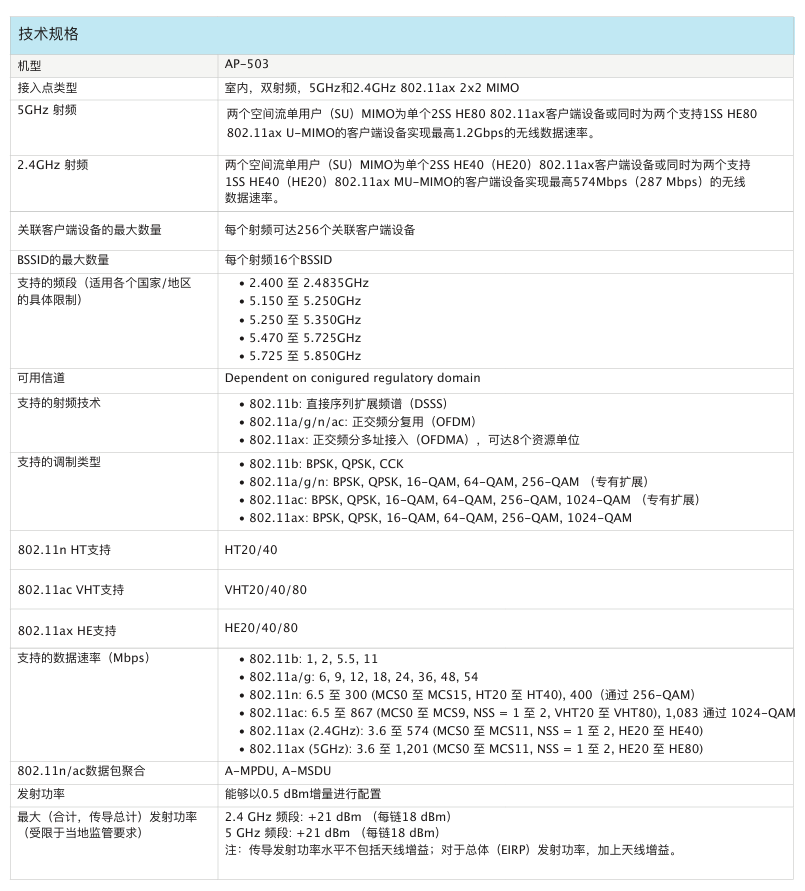 室内中密度Wi-Fi 6接入点AP-503给予兼具高成本效益与高性能的连接,可以帮助各类组织应对因移动使用需求提高、转向云或物联网环境而带来的设备增长挑战。503 系列的实际聚合数据速率高达 1.775 Gbps(HE80/HE40),可以为学校、中型办公室和零售卖场等中等密度的场地和工作场所给予所需的连接速度和可靠性。